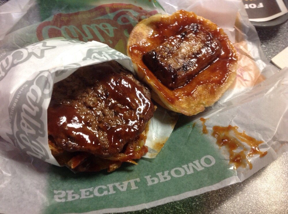 Three Charbroiled all-beef patties, two strips of bacon, melted American cheese, crispy onion rings and tangy BBQ Sauce on a Seeded bun. Served with fries and a soft drink.
